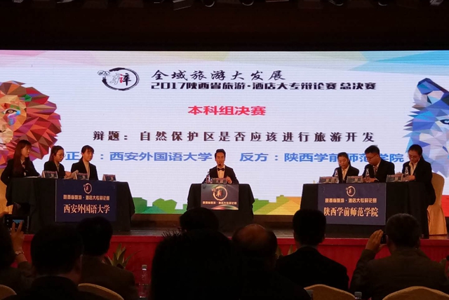 比赛环节由陈词立论、自由辩论、超级辩论及总结陈词四个环节组成。本次总决赛,我校旅游学院对阵陕西学前师范学院。此次比赛的辩题为“自然保护区应不应该建立旅游开发”,比赛期间旅游学院辩手极尽所能、利用丰富的专业知识回答评委及其尖锐的问题,获得一致好评。比赛气氛热烈高涨,掌声此起彼伏,可谓是一场精彩绝伦的视觉盛宴。经过20分钟的精彩辩论评委对本次大赛做出点评,并且最终以旅游学院以6:3的分数获得冠军,而且评委破例评定本次比赛有两名最佳辩手,旅游学院2016级学生苏馨恬荣获总决赛最佳辩手。